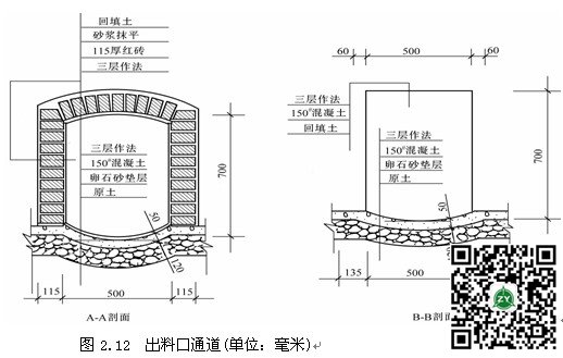 (1)砌筑出料口通道 出料口通道如图2.12所示。出料口通道用红砖及砂灰砌筑,水泥:砂子=1∶2.5。为了便于施工及出料,其通道口宽