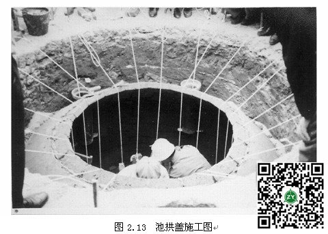 (3)池拱盖的施工 目前,“模式”中的沼气池拱盖用砖砌,“模式”中的沼气池一般采用直管进料,在砌筑池拱盖前要安装好进料管,一般利用直径
