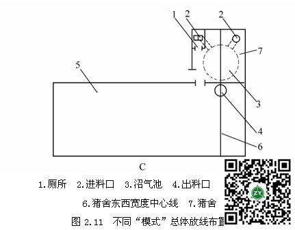 放线挖坑是保证建池质量的第一关,必须按规定尺寸施工。图2.11是三种“模式”总体放线布置图,供放线时参考。以图2.11中A图为例说明放线要点:①划出总体平面。②划出温室、猪舍面积,猪舍在东侧或西侧。③划出“模式”宽度中心线。④以O为起点,在猪舍内侧找出池的中心点O,以O为圆心,以池的半径加