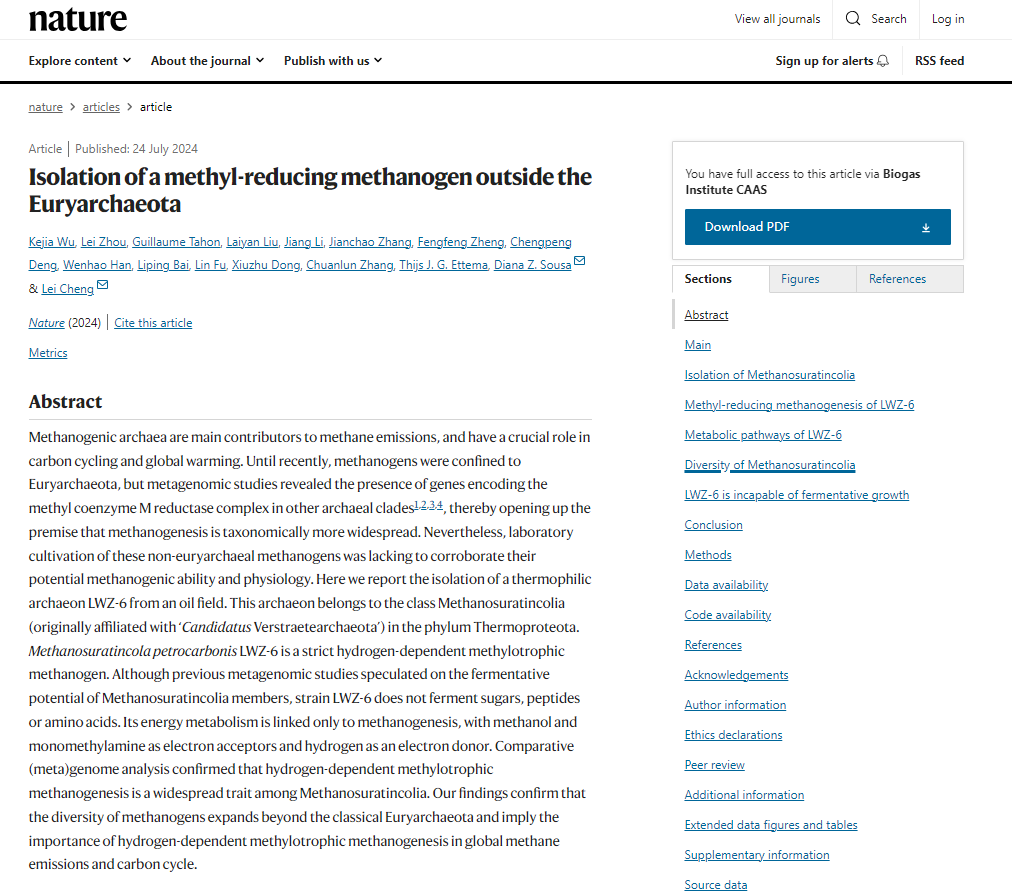 7月24日23时,《自然》在线发表了农业农村部沼气科学研究所厌氧微生物创新团队联合荷兰瓦赫宁根大学等多家科研单位的最新成果,该成果发现并分离培养了一种新型的产甲烷古菌——佛斯特拉门(Verstraetearchaeota)古菌。